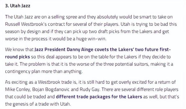 爵士送出博扬、康利、克拉克森得到威少、湖人2029年首轮。