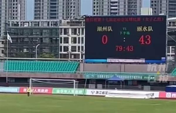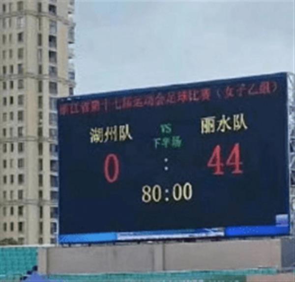 从网传视频来看,1日,浙江省第十七届运动会足球项目(女子乙组)竞赛,由湖州队对阵丽水队,竞赛进行到79分41秒的时分,比分是0 : 43。现场观众称,比分终究锁定在0 : 44。该视频引发网友广泛重视,有人惊奇:是不是记分牌出了问题;也有网友表示,省内女足这个比分正常。