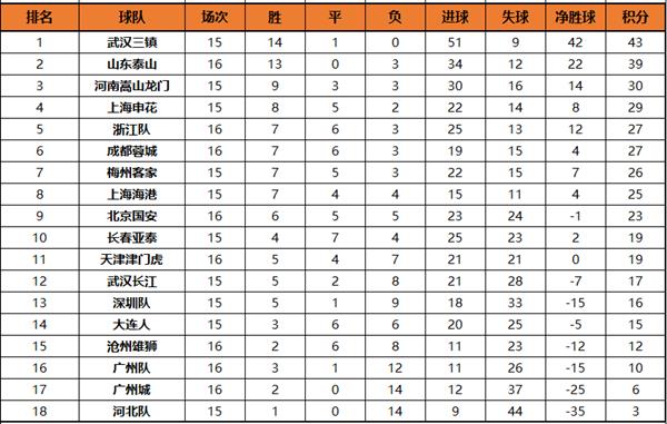中超积分榜:国安两轮不胜仍居第9三镇少赛一场领跑