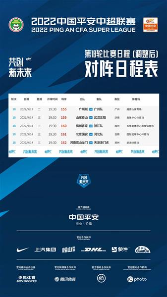因近期部分中超赛区属地疫情防控工作面临较大压力,为确保参赛人员安全及赛事有序进行,经商中超各赛区、各俱乐部,2022中超联赛委员会研究决定,调整2022中超联赛第18轮比赛日程如下: