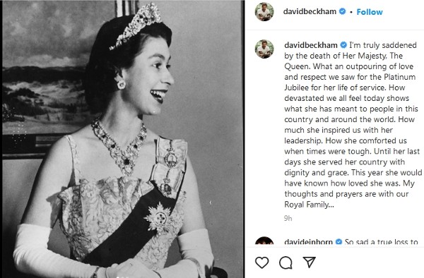 碧咸(英格兰足球名宿):我们今天的沉痛心情,证明她对英国和全世界的重要。她的领导才能啓发我们;当世道变得艰险,她慰藉我们;即使在她人生的後期,仍继续为国家服务。