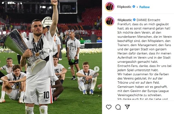 法兰克福上季捧走欧霸盃,高斯迪(filip kostic)的功劳不小,还以5球助攻成为该赛事的助攻王。临别在夕,已赴都灵体测的这位塞尔维亚中场,透过ig向效力4年的这间德甲球会,送上真挚的离别之言。