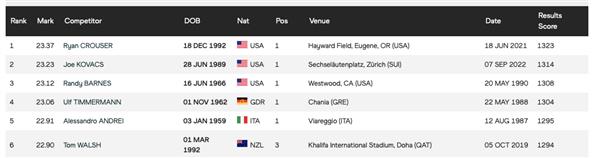 国际男人铅球前史排行榜,克鲁瑟、科瓦茨高居前两名。 国际田联官网截图