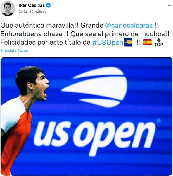 卡西利亚斯写道:“一个真正的奇迹!伟大的阿尔卡拉斯!恭喜你小伙子!愿这是你许多冠军中的第一个,祝贺你赢得美网男单冠军!”