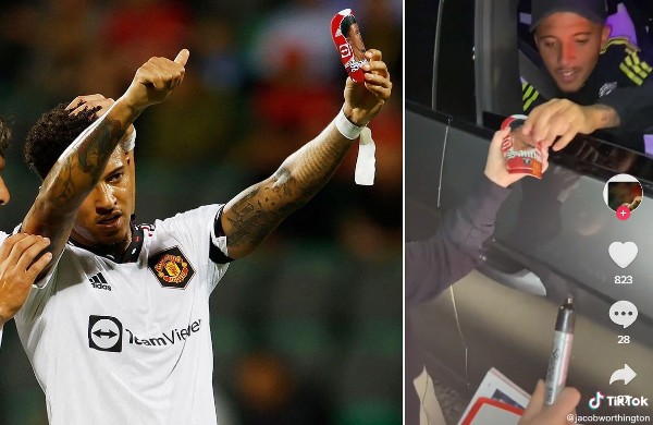 在周四欧霸盃建功的曼联翼锋山曹,庆祝入球时拿出了一个印上他样子的护胫,展示给在场球迷看,而这个护胫,原来是一名小球迷亲手赠送他的礼物。