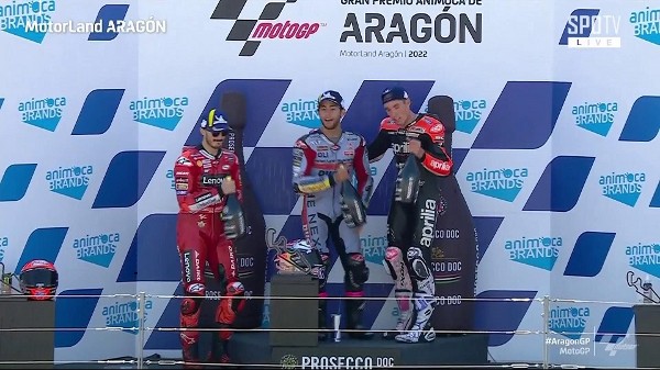 周日MotoGP阿拉冈站正赛,意大利车手巴斯迪安连尼相隔7站之後,以0.042秒力压意大利同胞巴尼亚,赢得个人今季第4个分站冠军。总成绩领先的昆达拿路就因为与马昆斯相撞,被逼退赛,总成绩被巴尼亚追至落後10分,今站获季军的A艾斯派加奴亦将差距收窄