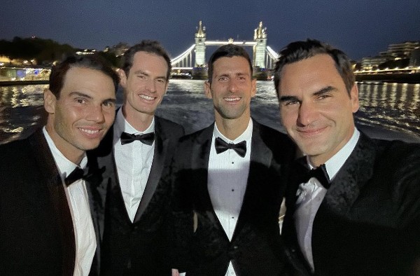 除了上载了这段片,费天王随後再上载另一张将成为经典时刻的相片。由於拿度周四早上已正式抵达伦敦,也已经落实这位22项大满贯球手,会是周五天王最後一击的梦幻拍档,正式集齐网坛4大天王後,费天王在与他们一同前往出席晚宴时,就和他们3人一同再自拍一张。