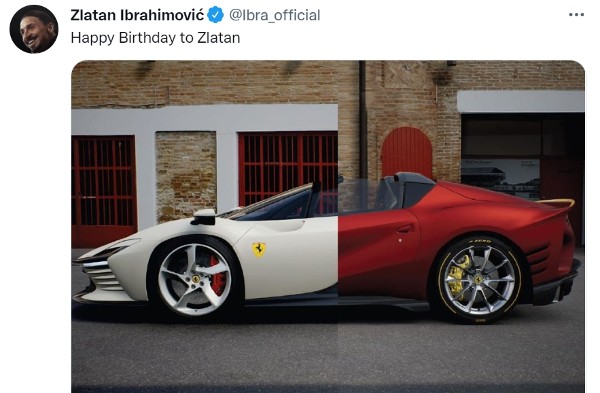 伊巴谦莫域(zlatan ibrahimovic)於周一10月3日41岁生日,他在twitter上载了一张法拉利名车的相片,前半为全白色,後半为全红色,似乎暗示买了两部名车为自己的生日礼物。