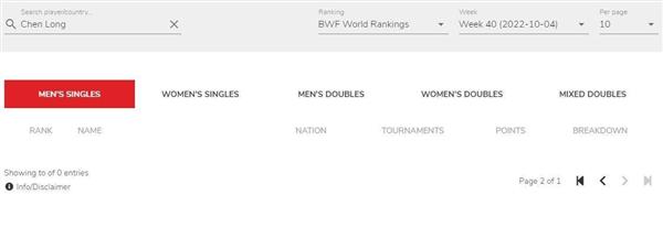 10月4日讯 国际羽联更新最新一期国际排名,2016年里约奥运会男单冠军谌龙的国际排名被移除,间隔退役或只差官宣。