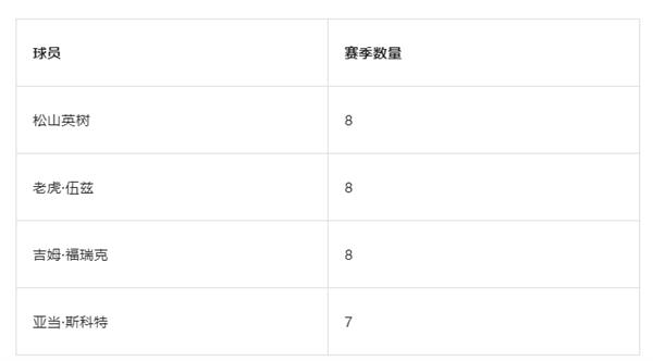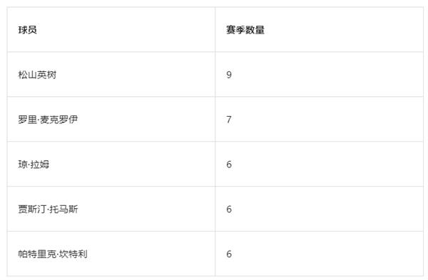 攻果岭得分杆数-赛季排名前10名次数-前四名(2004年至今):