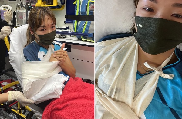 谢影雪在个人社交网站上载两张包紮右臂的照片,其中一张是被送上救护车。
