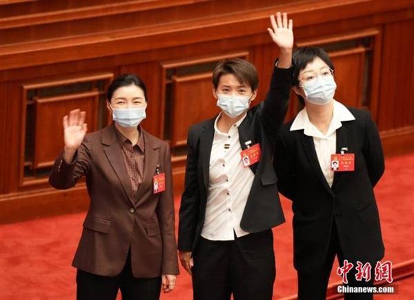 图为王霜(中)、仇斗丽(左)在开幕会后向记者挥手示意。 中新社记者 毛建军 摄