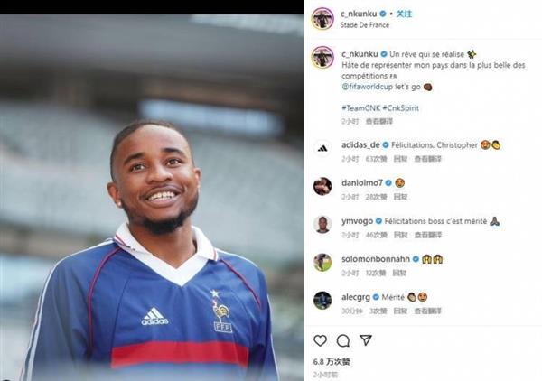 恩昆库还发布了他身穿法国球衣的照片,并说:“梦想成真!迫不及待地想为法国队效力。世界杯,让我们前进吧!”