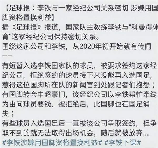 此前,李铁曾长期以国家足球队教练的身份带领国家足球队参加世界杯预选赛,但他的成绩并不理想。后来,有人甚至透露,李铁与一家经纪公司保持着密切的联系,利用自己作为男子足球教练的身份来获取利益,并让一些实力不足的球员有时间上场。后来,因为李铁下课了,这个消息就消失了。就在球迷们认为李铁可以逃脱的时候,现在有人曝光了这个消息,所以很多网民再次看到了李铁受到惩罚的希望。