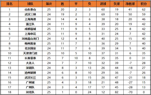 北京时间11月12日,中超联赛今天举行了四场比赛的第25轮,山东泰山队4-0击败河北队,暂时以3分领跑积分榜。而且广州键战中,广州城0-1输给梅州客家队,仍落后武汉长江队3分。另外,上海申花队2-3负于成都成都,积分被对手追平,天津津门虎以3-2击败长春亚泰。