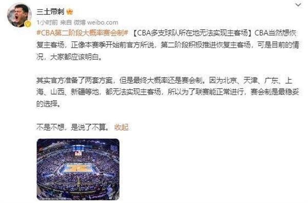 今天,11月13日,媒体人@三土带刺在微博透露,本赛季,CBA第二阶段大概率还是赛会制。