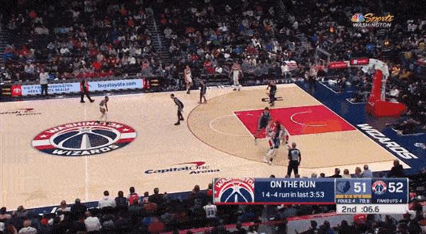 在上半场的最后一刻,波尔津吉斯耐心地调整了一下,击中了三分,帮助奇才队以55-51领先进入下半场。