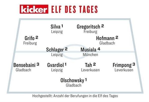 中场:格里福(弗莱堡),施拉格尔(莱比锡),穆西亚拉(拜仁),霍夫曼(门兴)