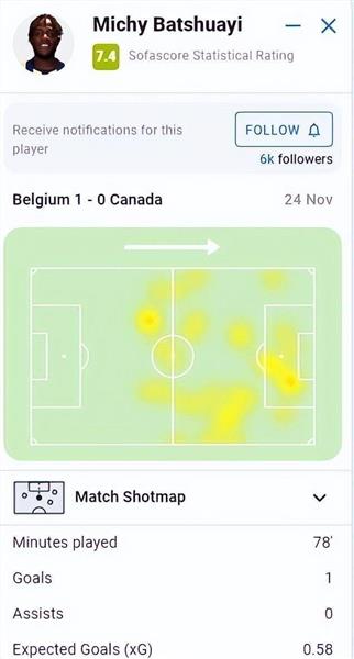 全场比赛78分钟,进1球,预计进球数为0.58球。他两次射正,一次射偏,两次射门被阻挡。27次触球,14次传球,9次成功,成功率64%,9次失球不多。