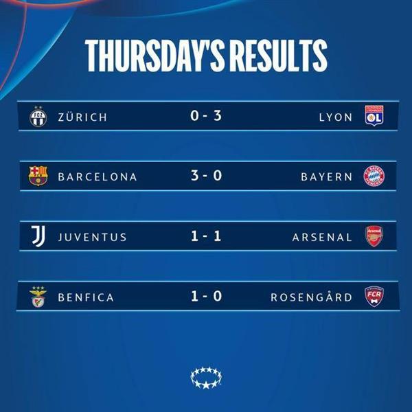 阿森纳女足以7分暂时排名C组第一,尤文以5分排名第二,里昂以4分排名第三,苏黎世以0分排名垫底。
