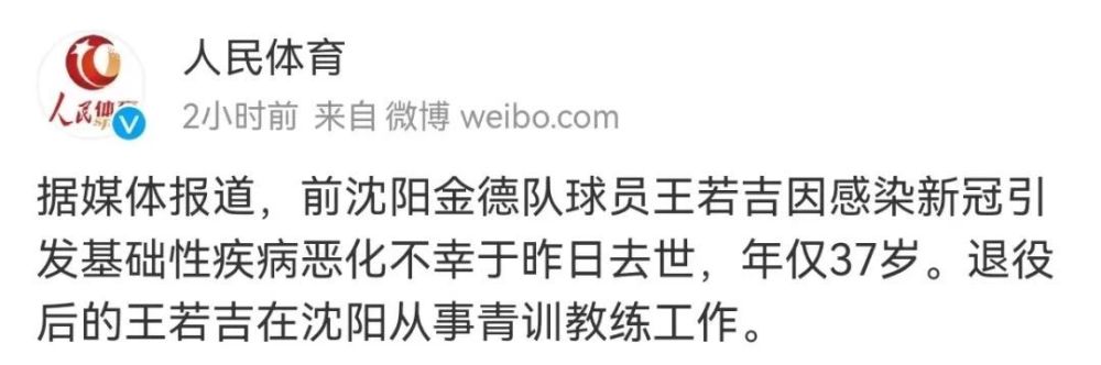 据媒体报道,前沈阳金德队球员王若吉因感染新冠军而死于37岁。退休后,王若吉在沈阳担任青年教练。