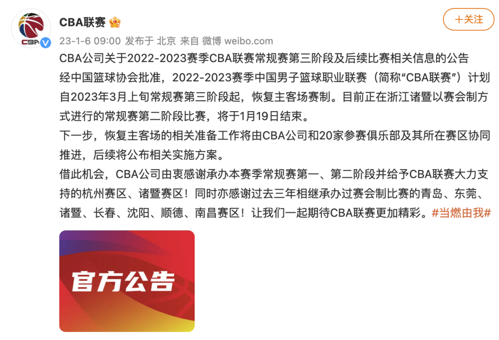 据@cba据中国篮球协会批准,2022-2023赛季中国男篮职业联赛计划从2023年3月初常规赛第三阶段开始恢复主客场赛制。浙江诸暨常规赛第二阶段的比赛将于1月19日结束。下一步,主客场的相关准备准备将由cba公司与20家俱乐部及其赛区合作推进,相关实施方案将在后续公布。