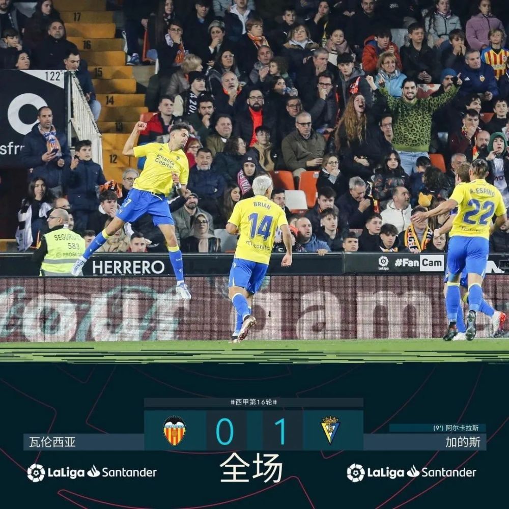 蝙蝠队在新年第一轮迎来了需要三分降级的加的斯。第三分钟,穆萨在禁区右侧的射门被封锁。第九分钟,索夫里诺帮助阿尔卡拉斯将球打入左上角,0-1。21分钟,莫里巴的头球稍微偏出,68分钟,加亚的远射被莱德斯马化解。瓦伦西亚控球占主导地位,但长时间无法进攻。最后,加的斯凭借阿尔卡拉斯的进球赢得了客场比赛,暂时逃离了降级区。