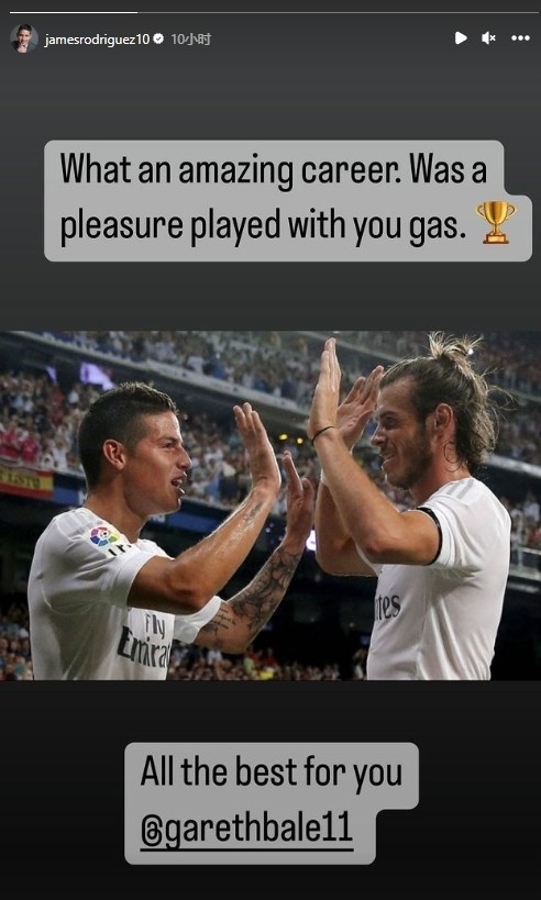 前皇家马德里球星贝尔宣布结束他的职业生涯,他的前队友哈梅斯·罗德里格斯也在社交媒体上向他致敬。