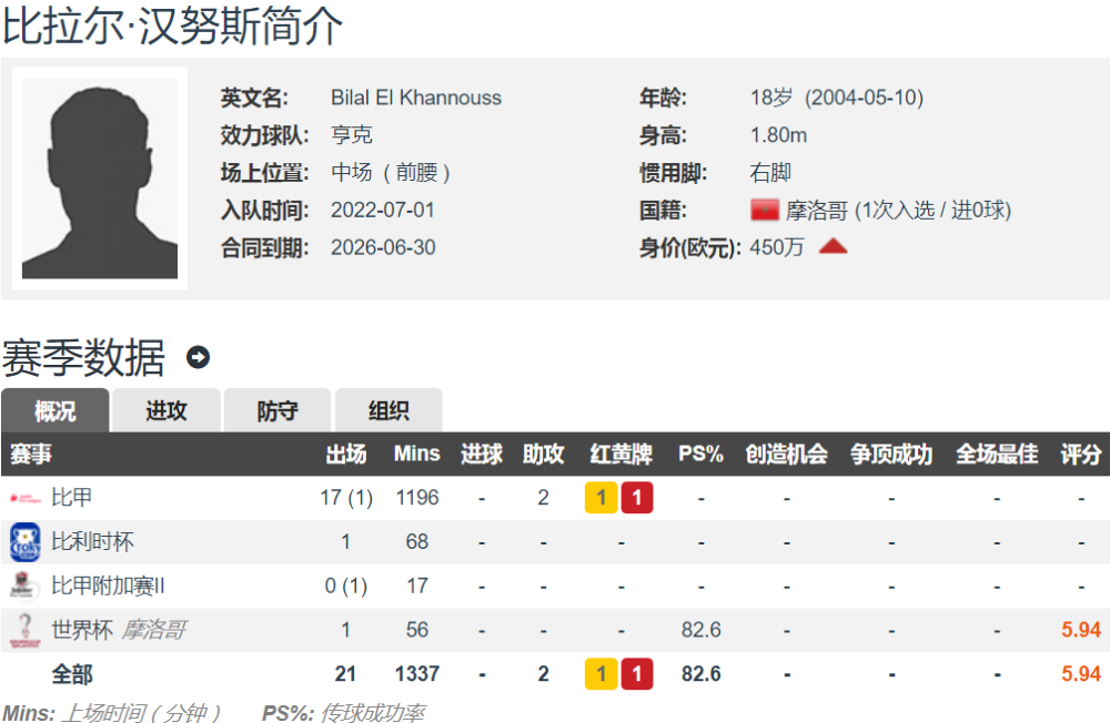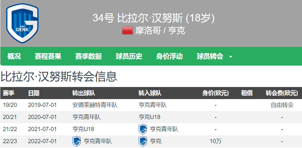 18岁的汉努斯,身高1.80米,右脚球员,以前腰位置为主,目前德转球员身价450万欧元,与亨克合同至2026年。