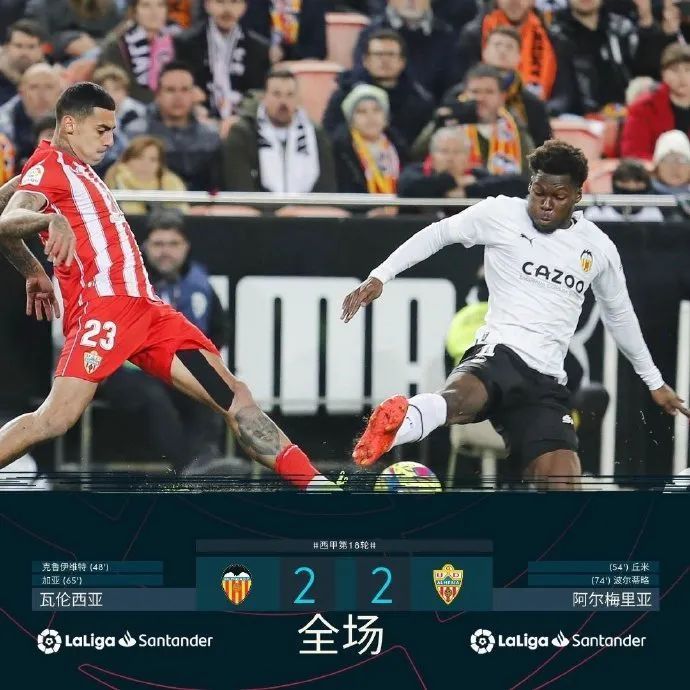 昨晚,西甲第18轮迎来了最后一场比赛。瓦伦西亚在主场梅斯塔利亚对阵阿尔梅里亚。克鲁伊维特和加亚两次领先瓦伦;布兰达里斯和波尔蒂分别做出了贡献,阿尔梅里亚顽强地两次扳平。最后,瓦伦西亚2-2阿尔梅里亚,两队握手言和。