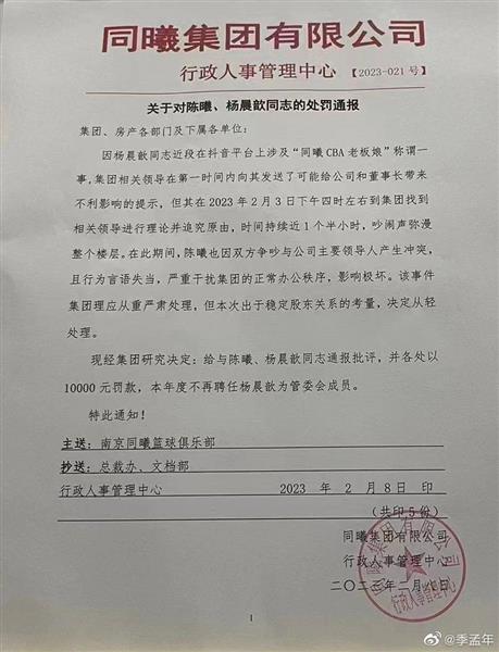 北京时间2月9日,《体育周刊》记者季孟年在社交媒体上发布了桐溪集团有限公司内部通知,通知显示陈妻子杨晨欣在社交媒体上使用“桐溪CBA老板娘”引起集团不满,在集团指示后,陈西来到公司与相关领导发生冲突。