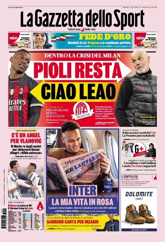 2月7日——今天,《米兰体育报》的头版关注了ac米兰的危机,标题是:“皮奥利留下来,再见莱奥。”