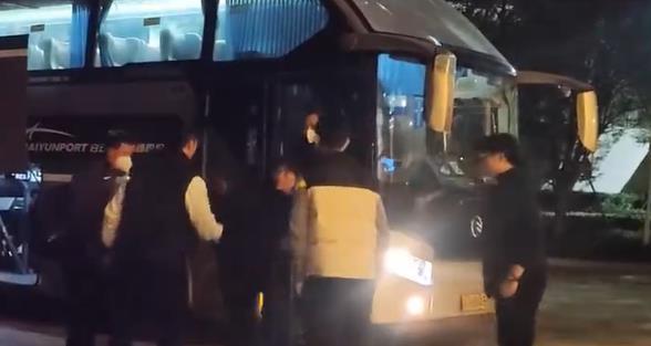 1月26日晚,中国女足主教练水庆霞(中)和队员抵达广州足球俱乐部训练基地。《广州日报》视频报道截图