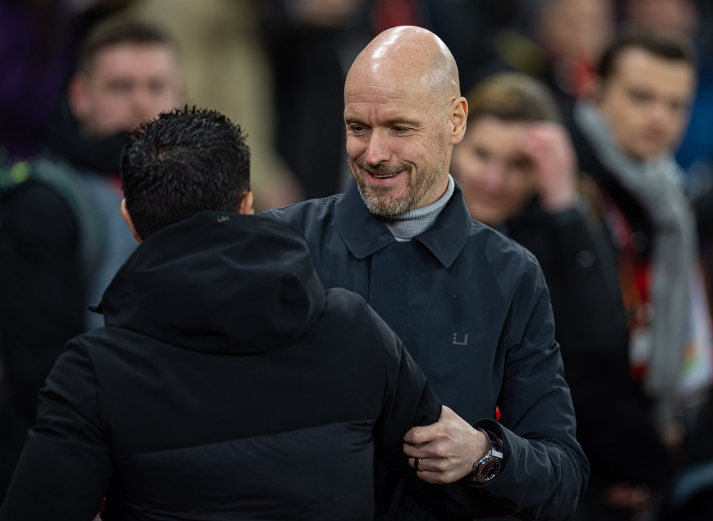 2月23日,曼联主教练滕哈格(右)在比赛前与巴塞罗那主教练哈维互相致意。新华社发