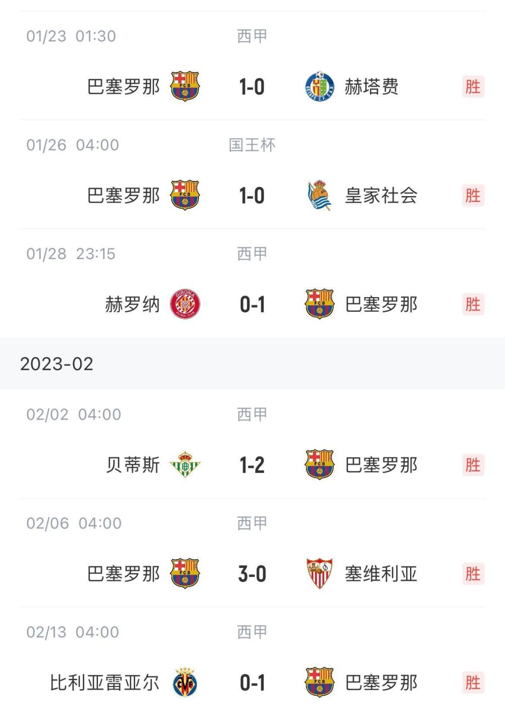 二月十三日消息?巴萨客场1-0击败比利亚雷亚尔,红蓝军团在最近6场比赛中以1-0获胜。