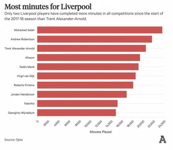 因此,阿诺德仍然是利物浦右后卫位置的唯一选择,并在本赛季的23场英超比赛中首发了20场(截至2月28日)。只有萨拉赫(2957分钟)和阿利森(2880分钟)超过了阿诺德(2451分钟)。