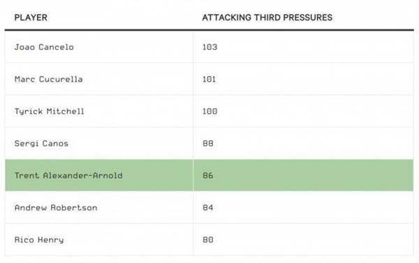 在克洛普的战术体系中,两名边后卫都承受着巨大的工作压力,他们必须在每场比赛中表现出非凡的耐力。2021/2022赛季,阿诺德是英超后卫中前压第五多的球员(前插入进攻三区)。