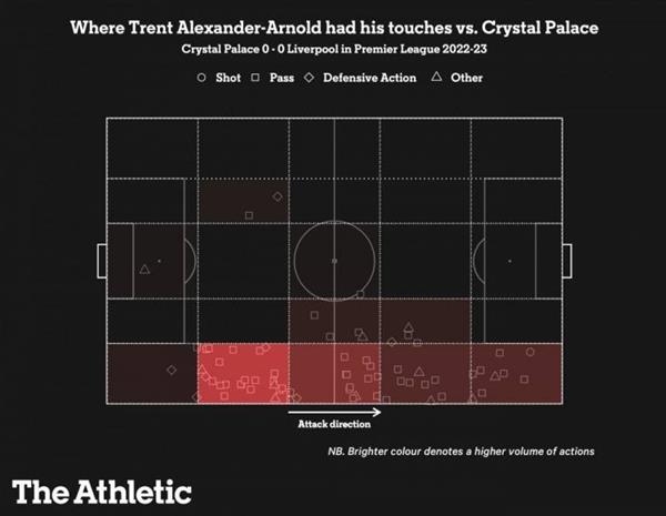 阿诺德看起来进攻能力明显下降的原因也可能与利物浦在比赛中缺乏控制有关,因为这使得阿诺德不得不完成更多的防守工作,并减少了他前进的频率。