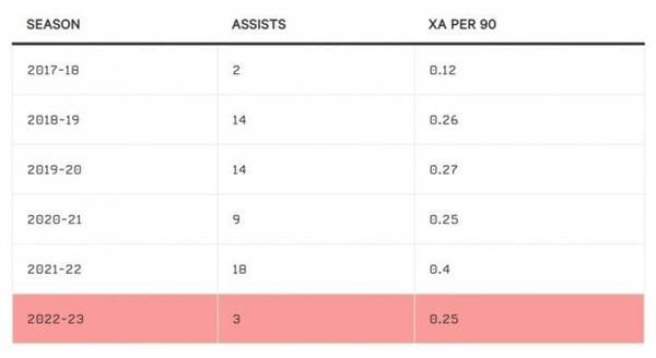 根据FBref的数据,阿诺德平均90分钟的预期助攻(0.25)明显低于上赛季(0.4),这表明阿诺德在创造得分机会方面的质量确实有所下降,但事实上,与前几个赛季相比,差异并不那么明显。