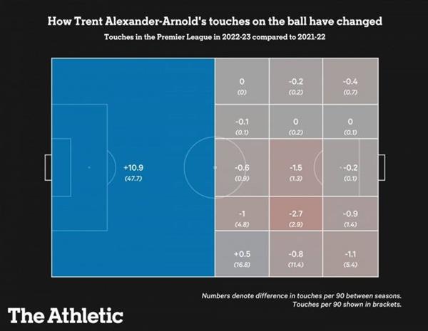 上赛季和本赛季,阿诺德的触球频率进行了比较