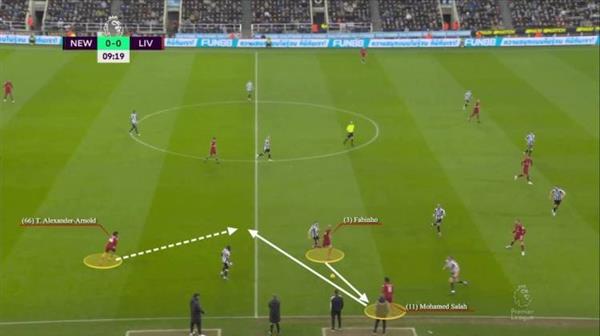 以乌拉圭前锋在对阵纽卡斯尔时的进球为例。在法比尼奥和萨拉赫巧妙地传球和接球后,阿诺德有足够的时间选择他的传球目的地。