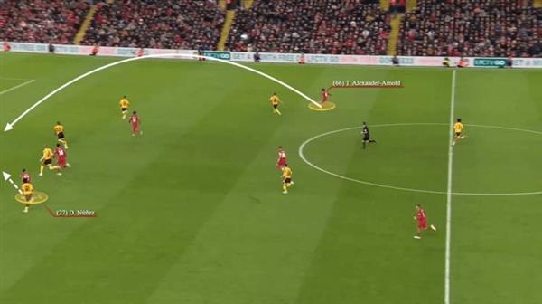 阿诺德和努涅斯在足总杯对阵狼队的比赛中也有过很好的联系,右后卫的直塞球是完美的。