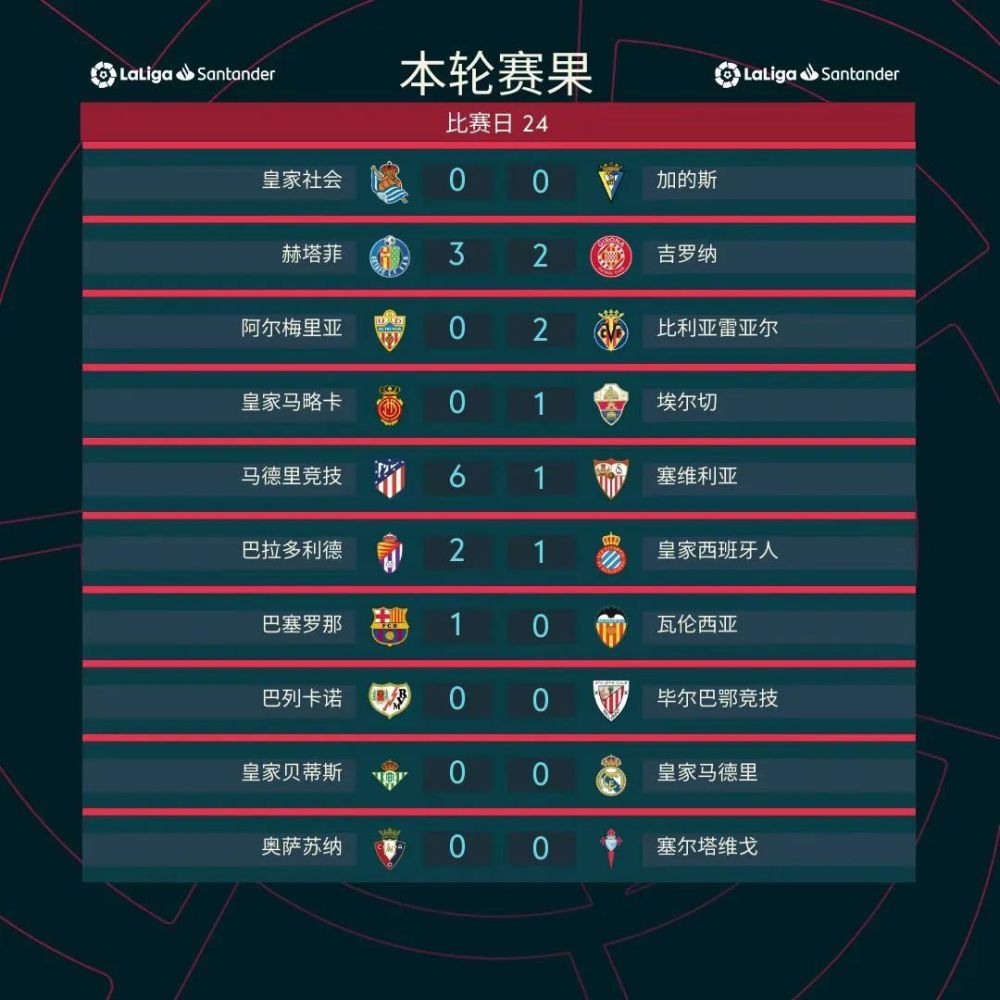 在积分榜上,奥萨苏纳以平局超越毕尔巴鄂竞技获得第八名,塞尔塔超越西班牙人获得第12名。本轮结束后,阿尔梅里亚、瓦伦西亚和埃尔切陷入降级区,而巴萨、皇马、马竞和皇家社会在联赛中排名前四。