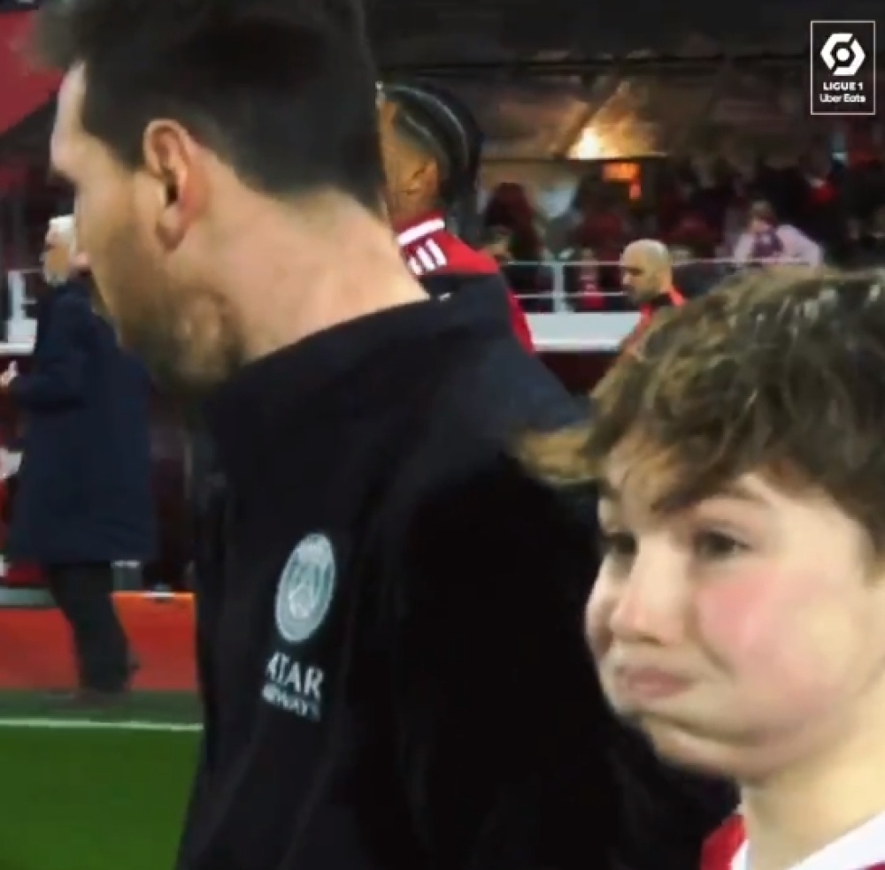 在赛前,法甲西班牙语官方推特展示了小球童和梅西进场时的视频,球童非常兴奋,脸也憋得通红。接着,还在回头看梅西。