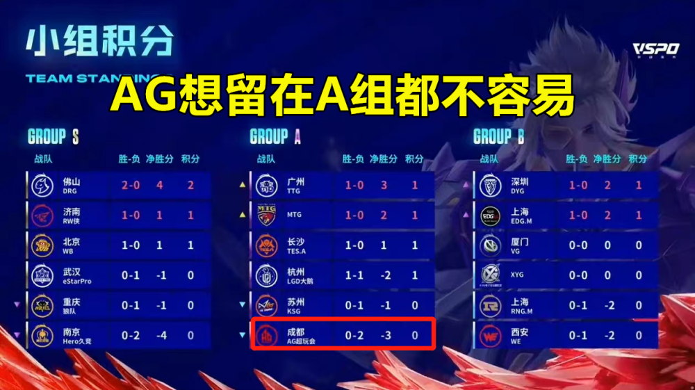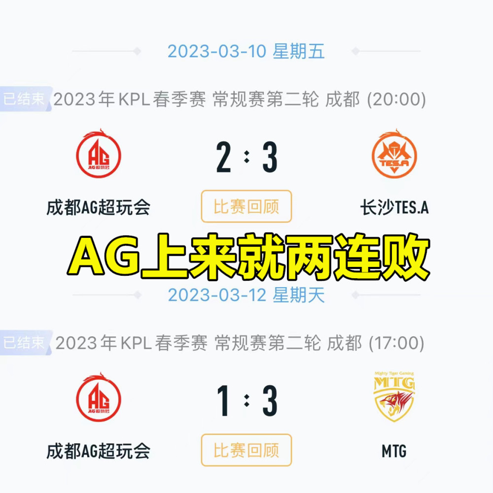 2023年KPL春季赛常规赛第二轮第一周的所有比赛都圆满结束了!这一次,我们将重点讨论主角AG超级游戏俱乐部。他们本周有两场比赛。不幸的是,AG超级游戏俱乐部一上来就吃了两连败。首先,它以2比3输给了TES,然后以1比3输给了MTG。你知道这意味着什么吗?这意味着AG超级游戏俱乐部基本上已经决定错过S组了?这还不是最糟糕的。最糟糕的是,今天的AG超级游戏俱乐部留下A组并不是一件简单的事情。这是为了B组历史。