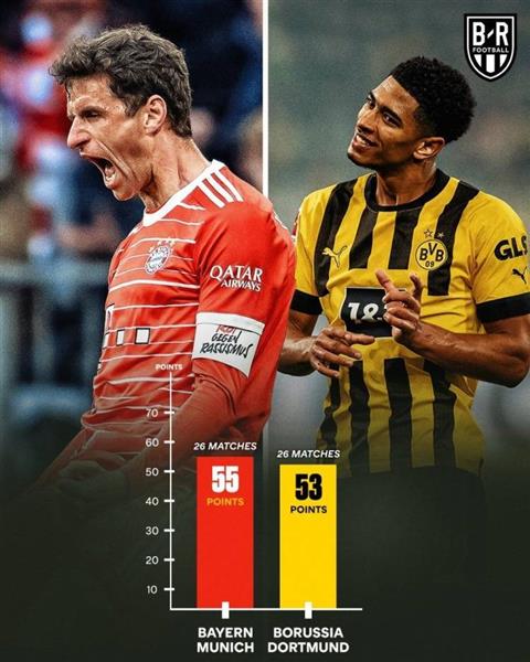 德甲(2分):拜仁26轮55分,多特26轮53分