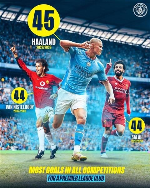 这个进球是哈兰德在2022-23赛季打进的第45个进球,超越了萨拉赫(2017-18赛季)和范尼斯特鲁伊(2002-03赛季)创造的44个进球纪录,成为单个赛季进球最多的英超球员。这45个进球中,包括27场30个进球,欧冠7场11个进球,足总杯2场3个进球,联赛杯2场1个进球,社区盾杯1场0个进球,总共39场45个进球。另外,哈兰德还贡献了6次助攻,加盟曼城的处子赛季到目前为止的数据是39场51个进球。