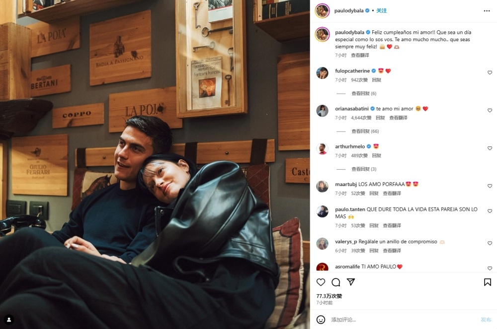 4月19日是迪巴拉女友奥利亚娜27岁生日。迪巴拉在Instagram上发布了一张他们的亲密照片,并说:“亲爱的,生日快乐!愿这一天和你一样特别。我多么爱你...祝你永远幸福!之后还有爱情和生日蛋糕的图标。