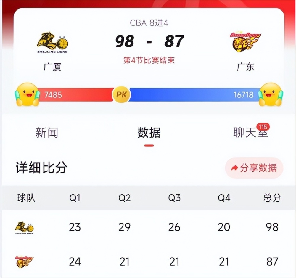 在最后一节,马尚在短短4分钟内得到10分、1次助攻和1次抢断,帮助广东直接缩小到5分。然而,胡金秋立即连续命中三球,帮助广厦稳定战局。胡金秋也很快完成了20+的数据。孙明辉连续打铁替补席,威尔斯命中关键中距离。马尚感觉下滑后,广东开始崩溃,最终吞下失败。