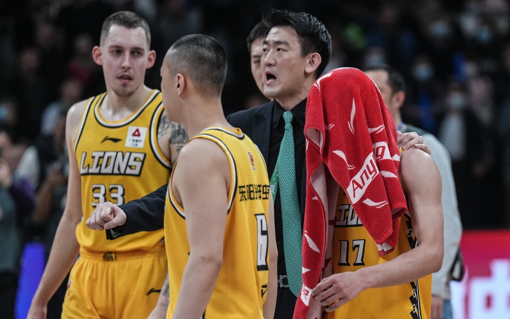 广厦教练王博安慰用毛巾蒙脸的孙铭徽。图片/新华社